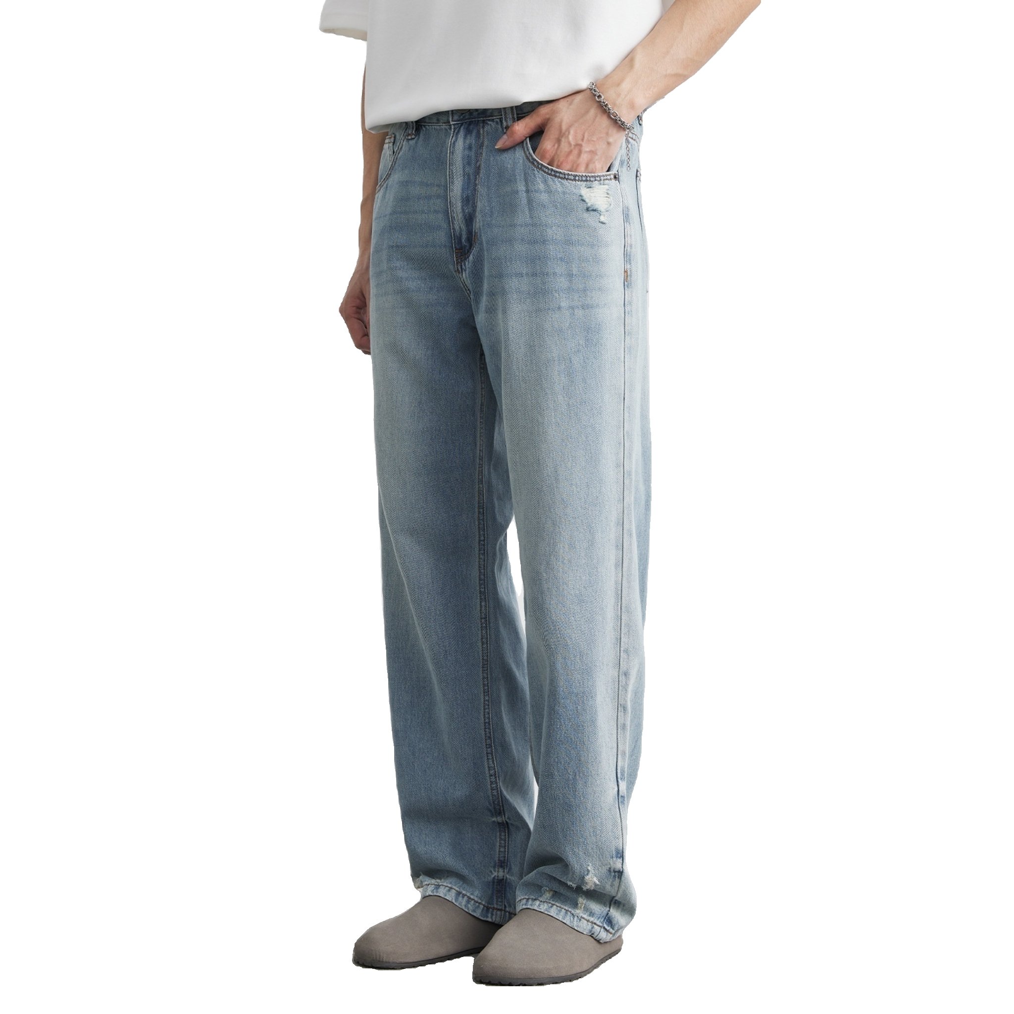 Elevate your everyday wardrobe with these Light-wash Mens Ripped Straight-leg Jeans. Designed for modern versatility, they combine a clean, straight silhouette with subtle distressing for a refined, lived-in look. The light blue wash pairs effortlessly with casual and smart-casual outfits, making these jeans a year-round essential.
