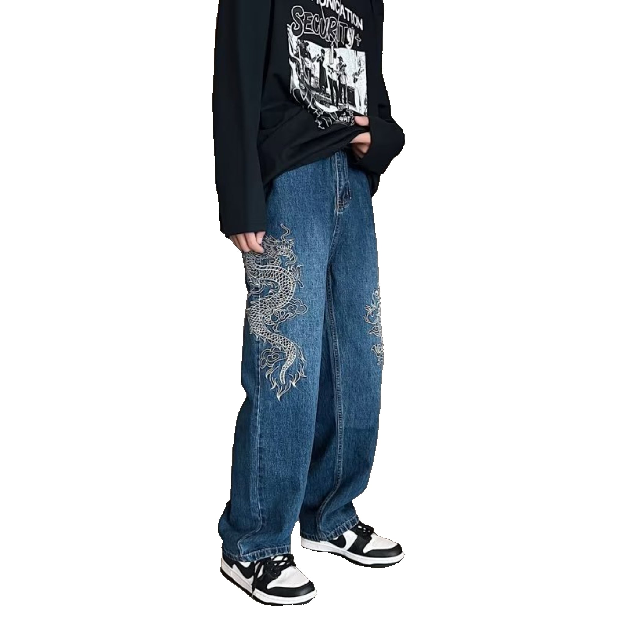 Elevate everyday style with the Loose Embroidered Jeans For Men. A striking Golden Dragon motif meets a relaxed, baggy fit for comfort and impact.